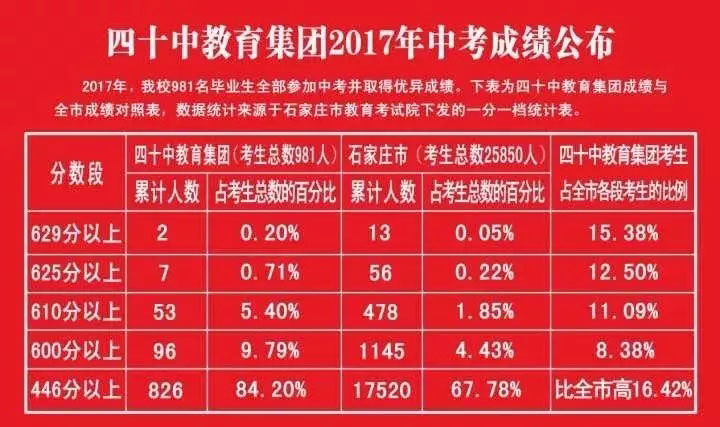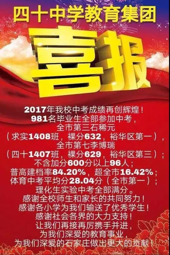 石家庄市第四十中学1974年建校,是一所纯初中学校。学校的工作方针是“始终坚持以德育为首,教学为中心,科研为先导的。”育人宗旨为“不苛求人人成才,但必须个个成人”。学校的奋斗目标是“一流管理、一流师资、一流校风、一流设备、一流质量、一流环境。”